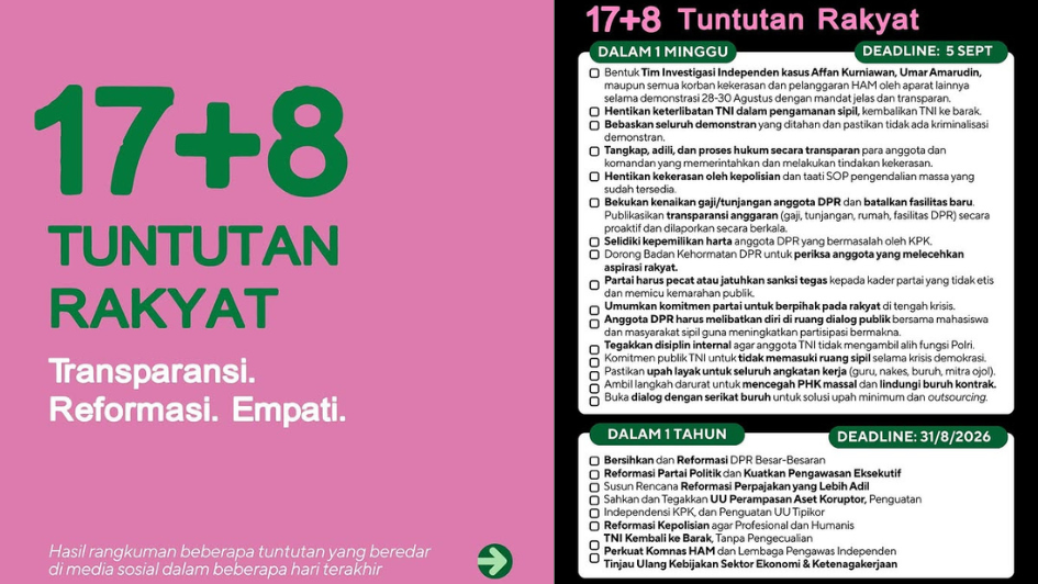Di tengah perdebatan mengenai amnesti, publik juga menyuarakan tuntutan yang dikenal sebagai “17+8”. Tuntutan ini mencerminkan desakan masyarakat agar pemerintah tidak hanya fokus pada penerimaan negara, tetapi juga memperhatikan kesejahteraan rakyat melalui penciptaan lapangan kerja, stabilisasi harga, serta perlindungan sosial. Pemerintah merespons aspirasi ini dengan sejumlah kebijakan cepat, termasuk program pemberdayaan ekonomi lokal, dukungan terhadap industri padat karya, dan intervensi untuk menjaga daya beli masyarakat. Respons yang disebut “respon cepat 17+8” ini penting untuk meredam ketegangan dan menunjukkan komitmen pemerintah bahwa reformasi fiskal berjalan beriringan dengan kepentingan sosial-ekonomi yang lebih luas.